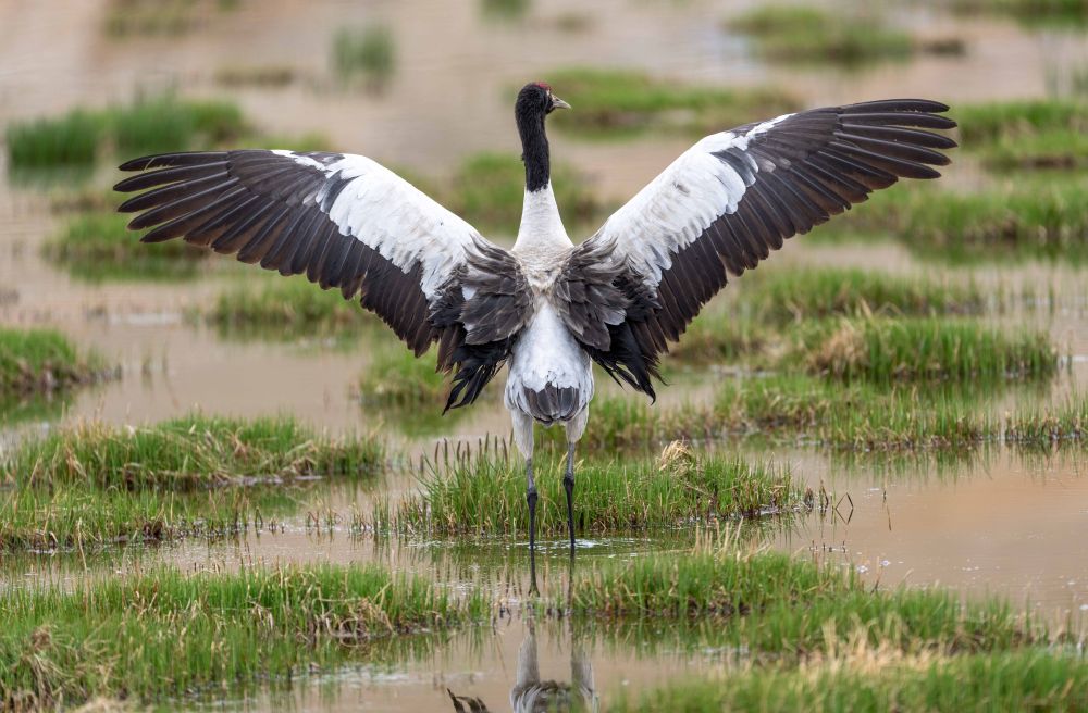 6月4日拍攝的在那曲市申扎縣周邊濕地裏棲息的黑頸鶴。新華社記者 旦增尼瑪曲珠 攝