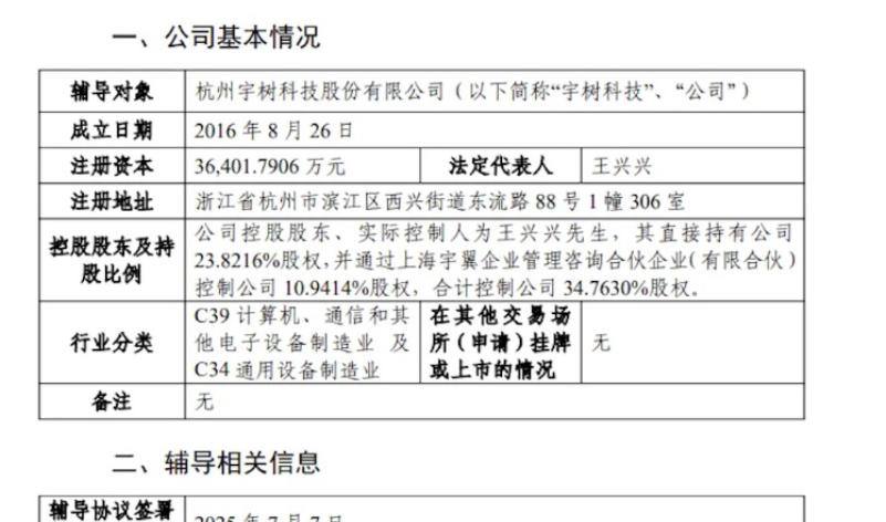 【環球網財經綜合報道】7月18日,中國證監會官網披露,杭州宇樹科技股份有限公司已正式啓動上市輔導,輔導機構為中信證券。根據備案報告,公司控股股東、實控人王興興通過直接及間接方式合計控制34.7630%股權。