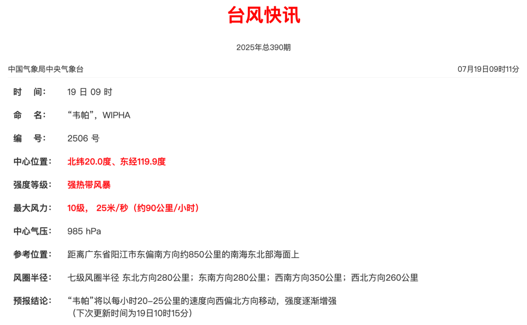 *大風預報:*7月19日08時至20日08時,受“韋帕”和西南季風的共同影響,南海大部、巴士海峽、台灣海峽、台灣以東洋麪、東海南部、廣東東部沿海、福建沿海、台灣島將有6~7級風,陣風8~9級,南海東北部海域、巴士海峽、台灣海峽北部海域風力可達8~10級,陣風11~12級,颱風中心經過的附近海域風力有10~12級,陣風13~14級。