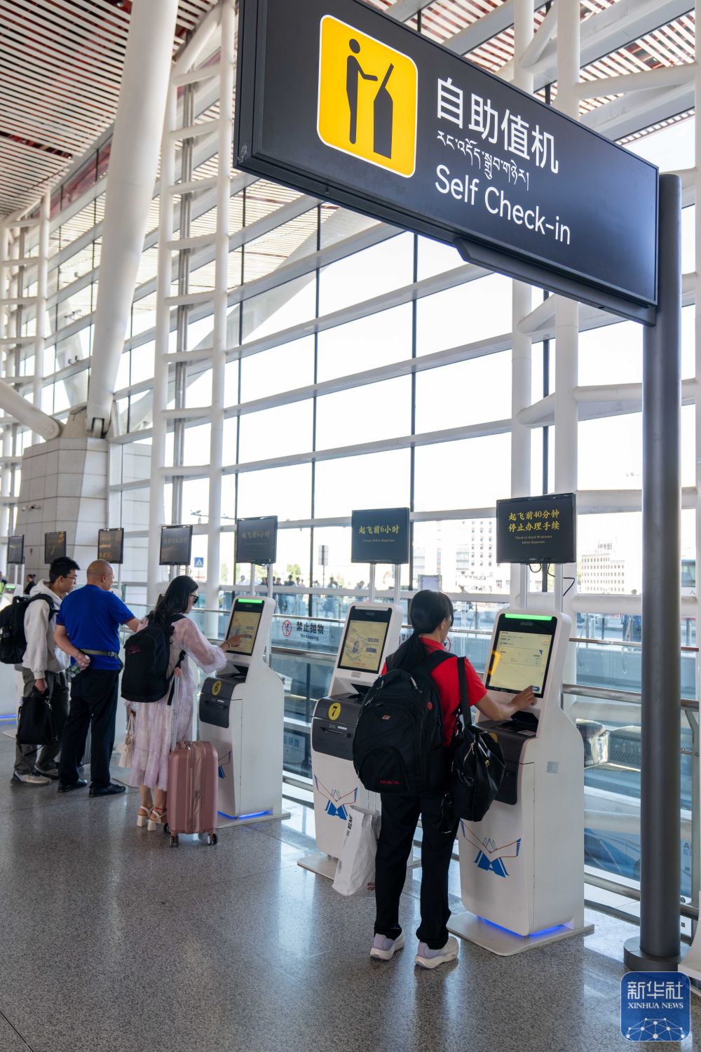↑ 7月18日,旅客在拉薩貢嘎國際機場自助值機。