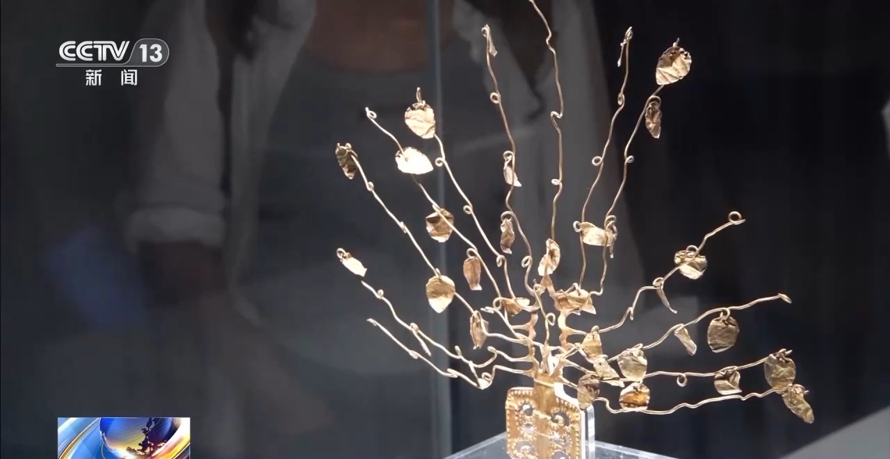 *總枱記者 楊雪:*金光燦爛、搖曳生姿。很多遊客在遊覽的過程當中,都情不自禁地用這8個字來形容我們看到的這款花樹狀金步搖,這款文物它出土於遼寧北票市的房身村,是三燕時期貴族當中非常流行的一種金質冠飾,距今已經有1700多年的歷史了。
