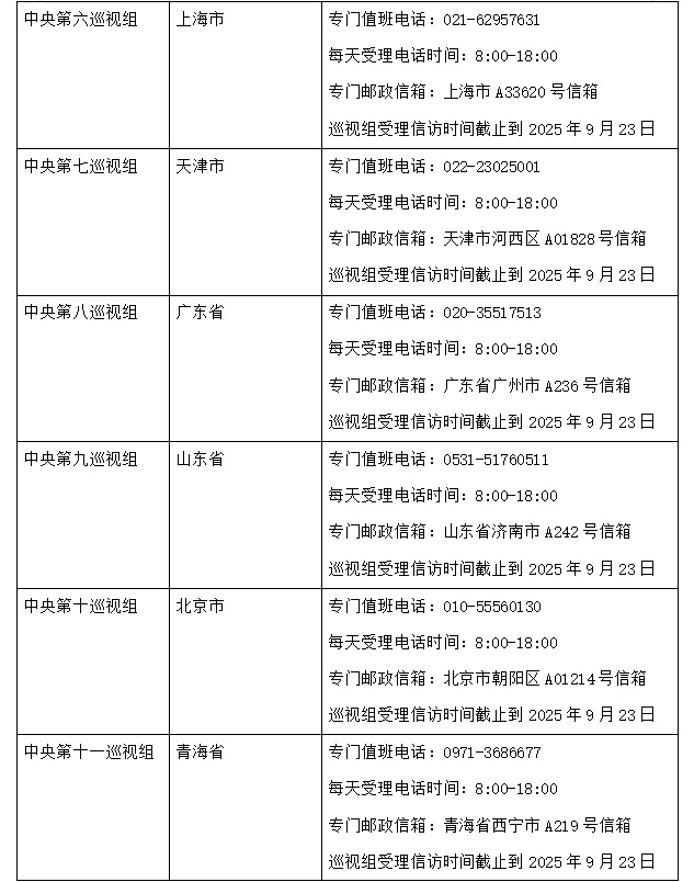 根據黨中央關於巡視工作的統一部署,近日,二十屆中央第六輪巡視的16個巡視組陸續開始進駐被巡視地區,並公佈了聯繫方式。