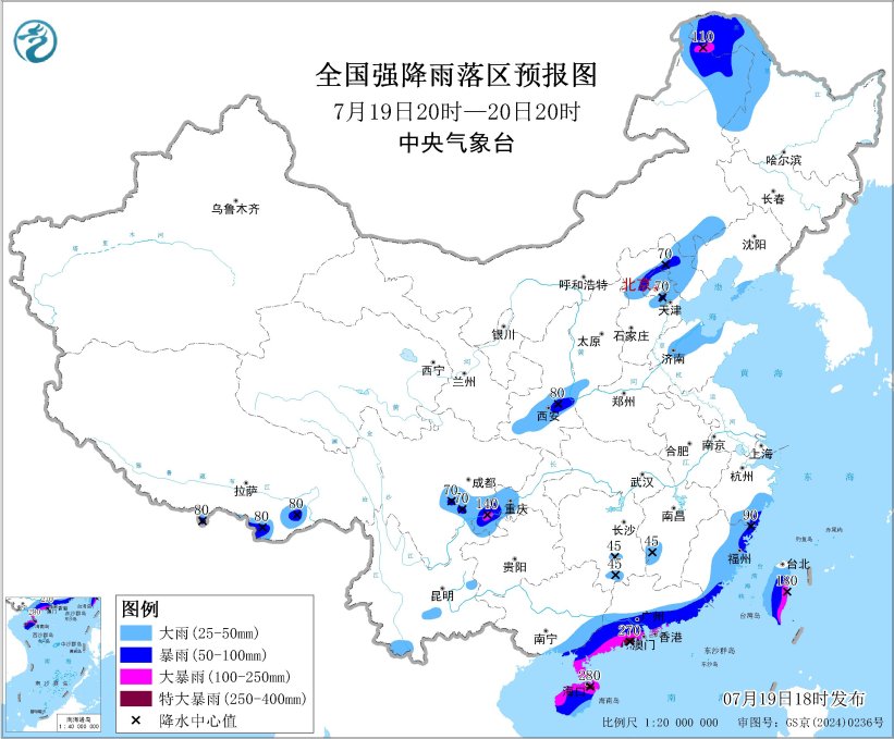 預計,7月19日20時至20日20時,海南島、廣東中南部、廣西東南部、福建東部、浙江南部、江西西南部、湖南南部、台灣島大部以及內蒙古東部、黑龍江西部、陝西南部、山西西南部、河北北部、北京中北部、天津中北部、山東北部、遼寧西部和東南部、四川盆地南部、重慶西南部、西藏東南部等地有大到暴雨,其中,廣東西南部、海南島北部、內蒙古東北部、四川盆地南部、台灣島東部等地的部分地區有大暴雨,廣東西南部沿海、海南島東北部等地局地有特大暴雨(250~280毫米)。上述部分地區伴有短時強降水(最大小時降雨量20~50毫米,華南沿海局地可超過80毫米),局地有雷暴大風等強對流天氣。