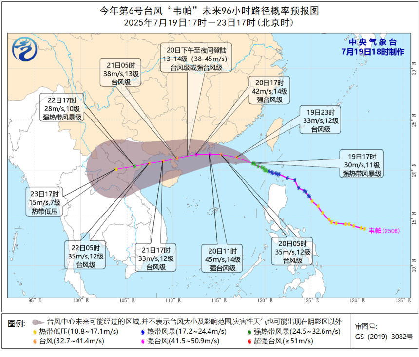 據中央氣象台最新預計,“韋帕”將以每小時30公里左右的速度向西偏北方向快速移動,強度繼續加強,向廣東珠海到海南文昌一帶沿海靠近,並將於20日下午至夜間在上述沿海登陸(13~14級,38~45米/秒,颱風級或強颱風級),以後穿過廣東雷州半島,21日白天移入北部灣海面,隨後趨向越南北部沿海。