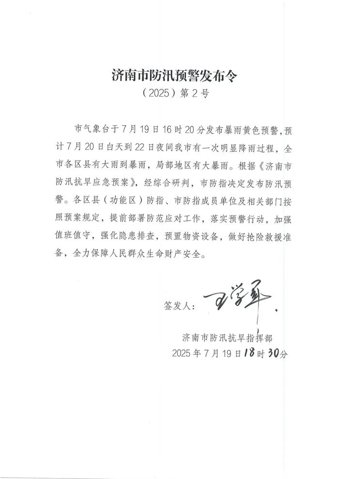 記者從濟南市防汛抗旱指揮部獲悉,7月19日18時30分,濟南市發佈防汛預警。