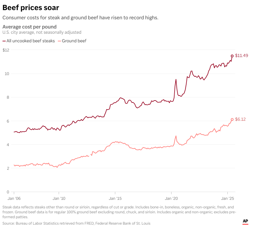 在過去的20年裏,美國牛肉價格一直在穩步上漲,牛羣數量幾十年來則一直穩步下降。今年1月1日,美國有8670萬頭牛和小牛,這是自1951年以來最低的牛羣數量。目前美國每年進口超過400萬磅的牛肉,特朗普的關税政策可能會成為推動牛肉價格繼續上漲的新因素。