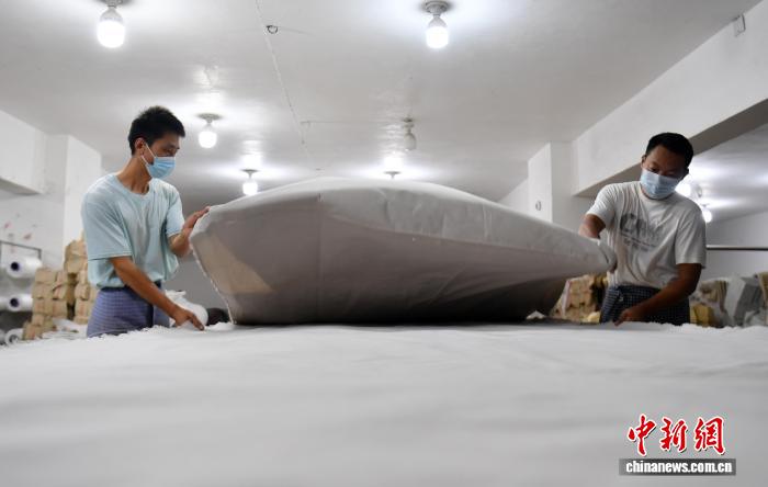 7月19日,河北省邯鄲市冀南新區光祿鎮一企業生產車間內工作人員正在生產勞保用品。