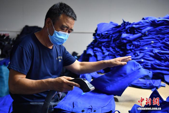 7月19日,河北省邯鄲市冀南新區光祿鎮一企業生產車間內工作人員正在縫製勞保用品。
