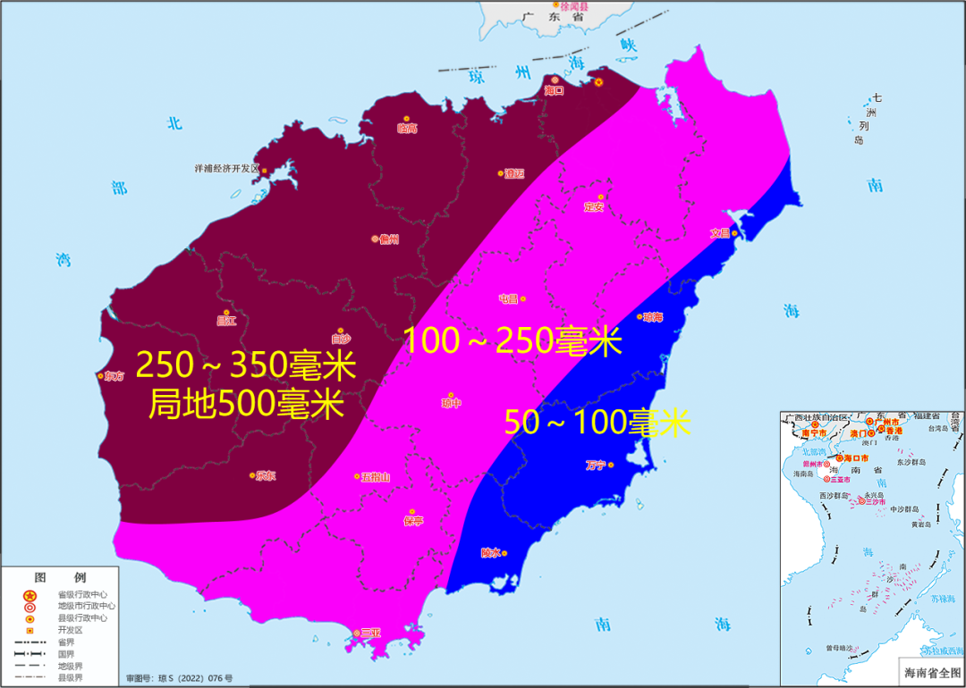 預計,20日08時~22日20時各地累積雨量:海口、澄邁、臨高、儋州、昌江、白沙、東方和樂東等市縣250~350毫米、局地500毫米;文昌、定安、屯昌、瓊中、五指山、保亭和三亞等市縣100~250毫米,瓊海、萬寧和陵水等市縣50~100毫米。