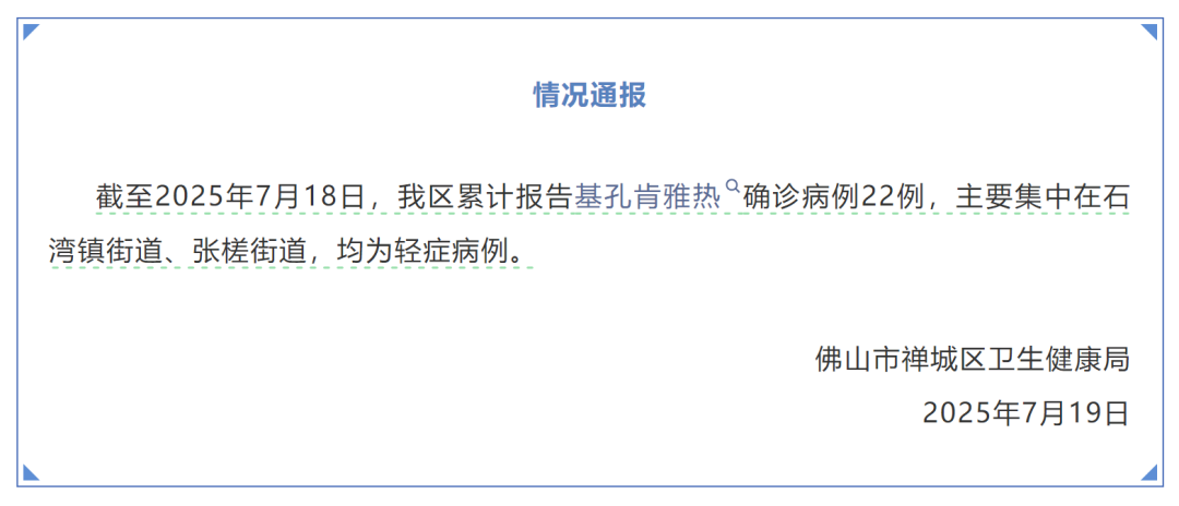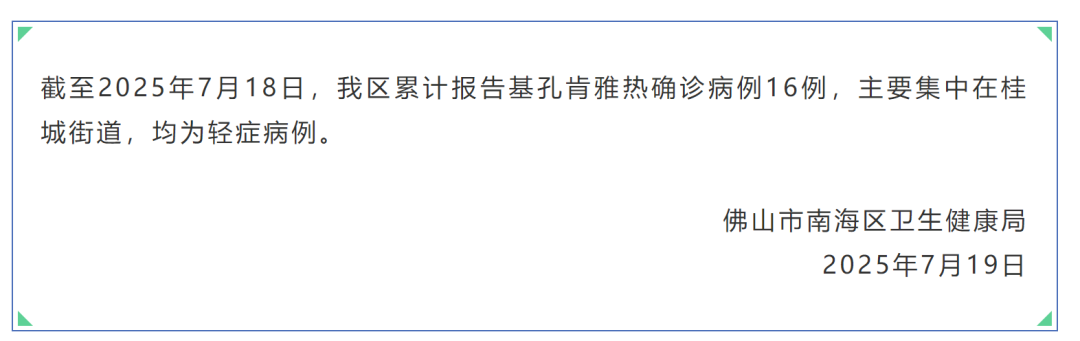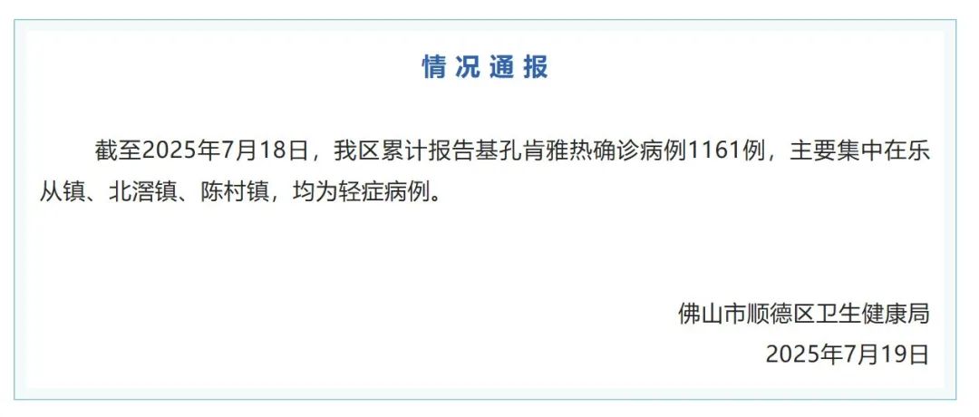 據此前報道,7月15日下午,廣東佛山市順德區衞生健康局通報稱,7月8日,順德區監測發現一起境外輸入引起的基孔肯雅熱本地疫情。