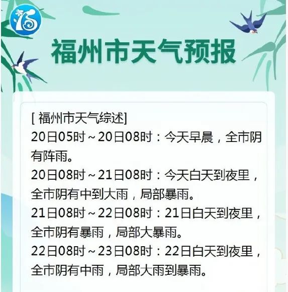 21日,全省陰有陣雨或雷陣雨,沿海地區部分暴雨,局部大暴雨;其餘地區部分大雨,局部暴雨。