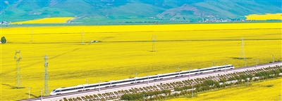 青海門源回族自治縣,一列高鐵動車駛過美麗的油菜花海。