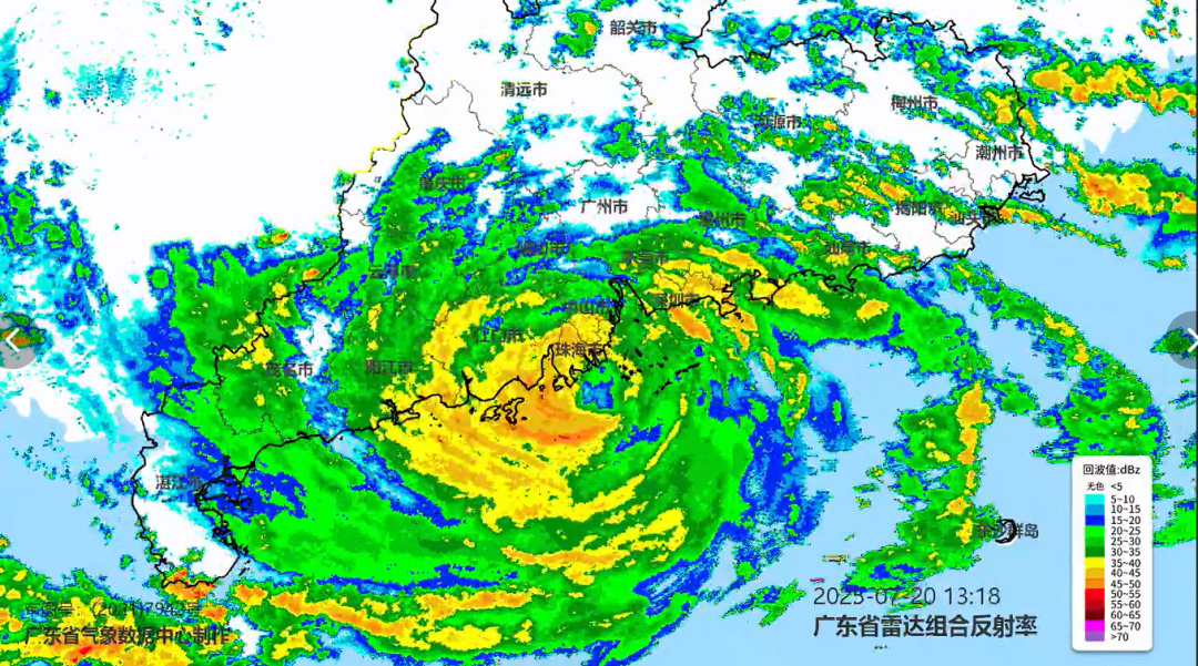 20日13時,今年第6號颱風“韋帕”(颱風級)中心位於北緯21點8度,東經113點7度,也就是在距離珠海市偏東南方向約35公里的珠江口外附近海面上,中心附近最大風力13級,達到38米每秒的風速,中心最低氣壓965百帕,八級大風範圍半徑約190公里。