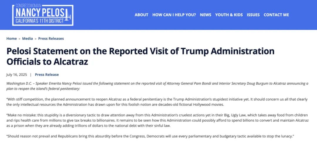 民主黨籍前眾議院議長佩洛西抨擊特朗普要建新“惡魔島”監獄的想法。恰好,“惡魔島”就位於佩洛西作為聯邦眾議員所代表的選區。