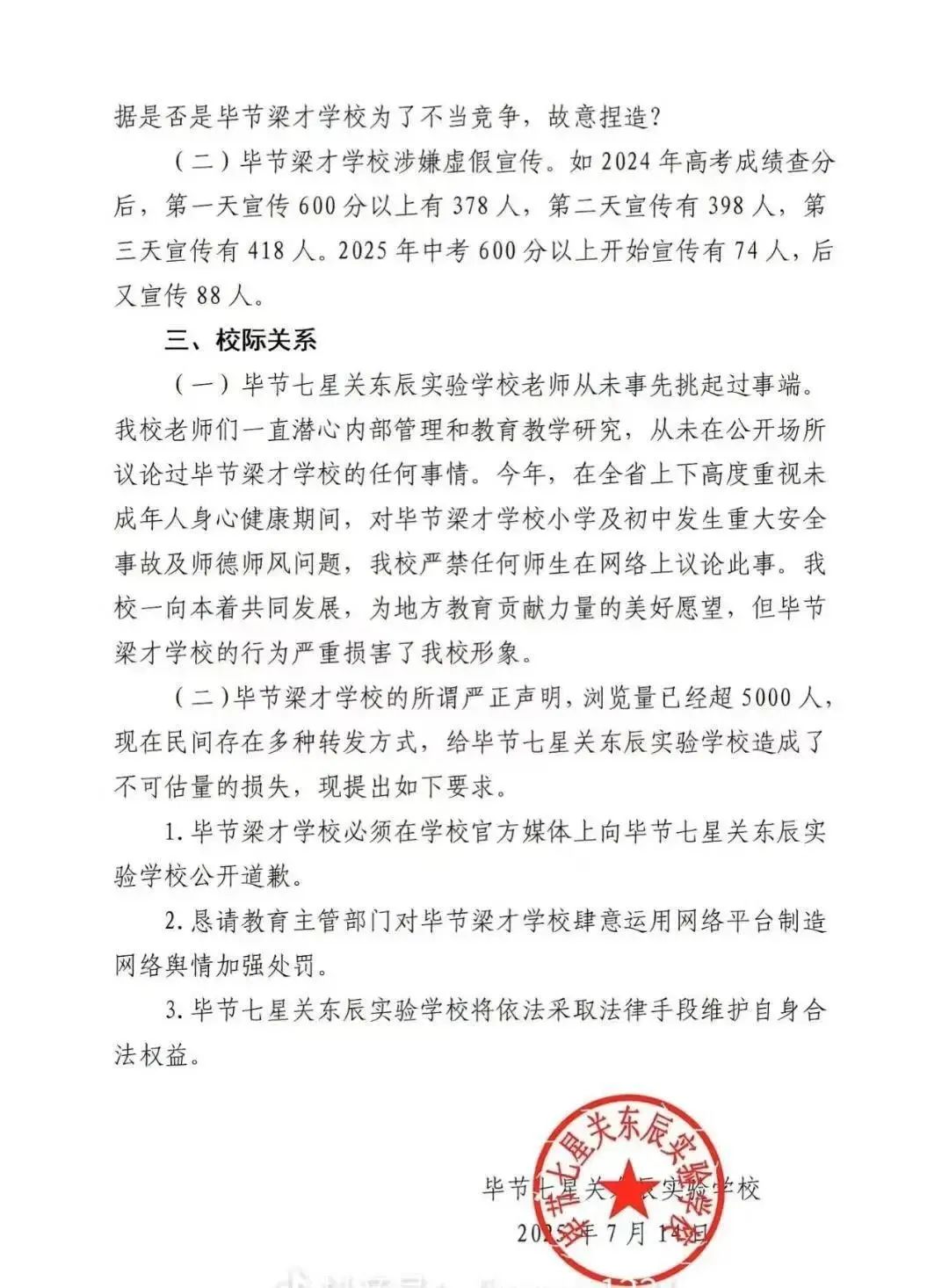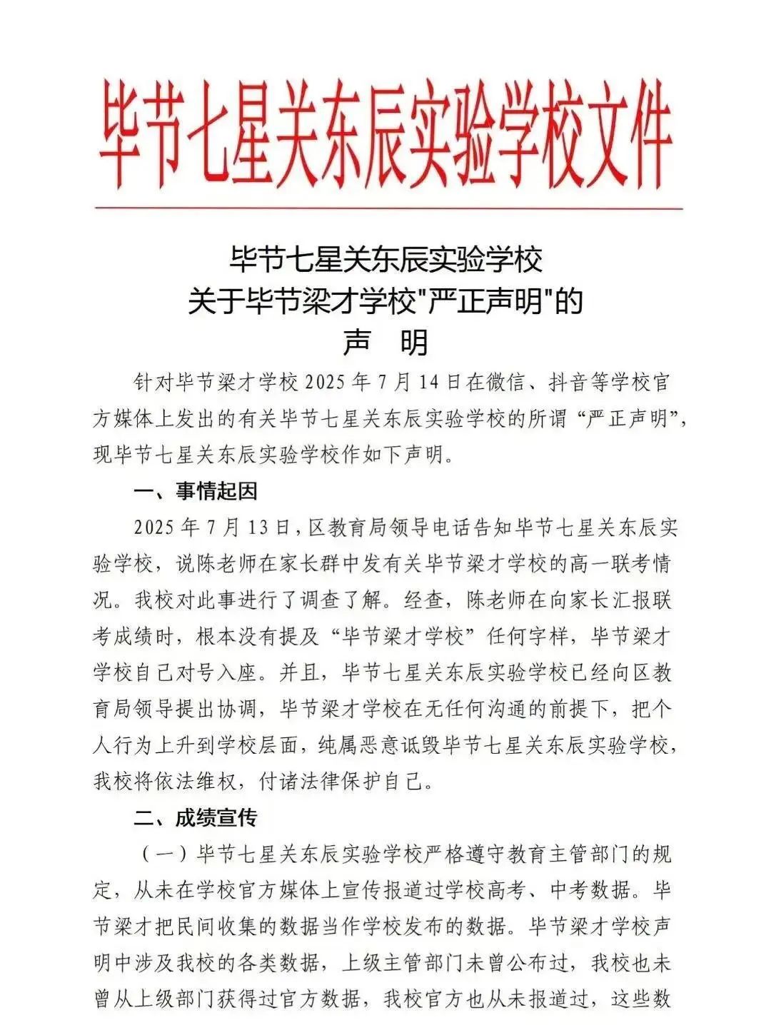 針對畢節梁才學校的聲明,當天,畢節七星關東辰實驗學校在其官方賬號發佈聲明,指責畢節梁才學校是自己對號入座。聲明中指控畢節梁才學校聲明中涉及該校的各類數據是為了不當競爭,故意捏造。