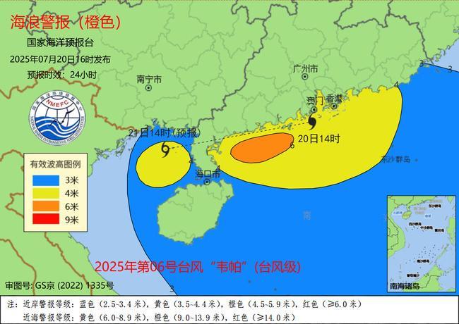 國家海洋預報台7月20日16時發佈*海浪橙色警報:*受今年第6號颱風“韋帕”(颱風級)的影響,預計,
