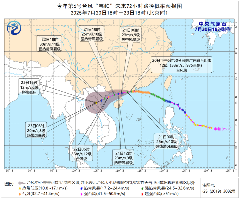 今年第6號颱風“韋帕”的中心已於今天(20日)下午5點50分前後在廣東省台山市沿海登陸,登陸時中心附近最大風力有12級(33米/秒,颱風級),中心最低氣壓為975百帕。登陸後,“韋帕”在廣東省台山市境內由颱風級減弱為強熱帶風暴級,下午6點鐘其中心位於北緯21.8度、東經112.6度,中心附近最大風力有11級(30米/秒),中心最低氣壓為980百帕。