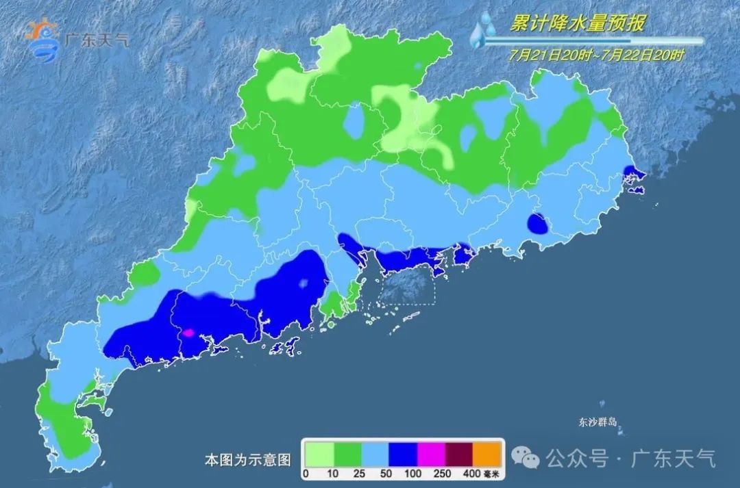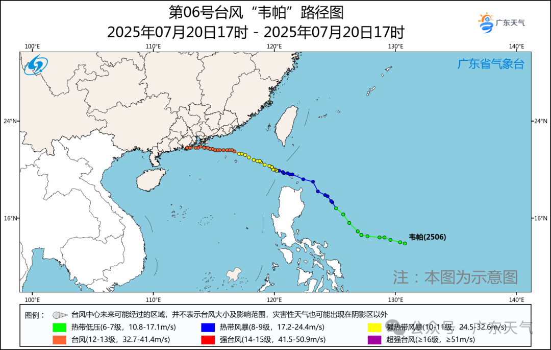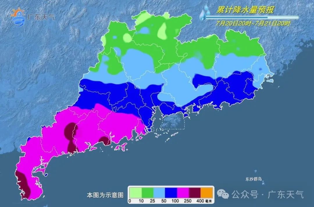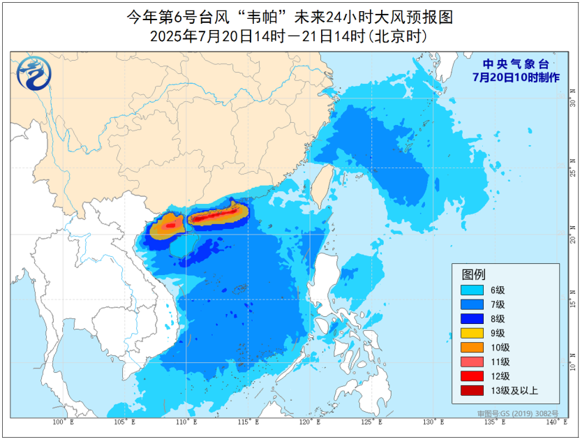 中央氣象台預計,7月20日14時至21日14時,廣東中南部、香港、澳門、海南島、廣西南部、福建東部、浙江東南部、江西西南部、湖南西南部、台灣島中南部等地有大到暴雨,其中,廣東西南部、香港、澳門、海南島中北部、廣西東南部沿海等地的部分地區有大暴雨,廣東西南部、海南島北部等地局地有特大暴雨;南海北部、廣東南部及沿海、珠江口、香港、澳門、雷州半島及其沿海、廣西南部及沿海、北部灣的風力可達8~11級,陣風12~13級,颱風中心經過的附近海域和地區的風力有12~14級,陣風15~16級。