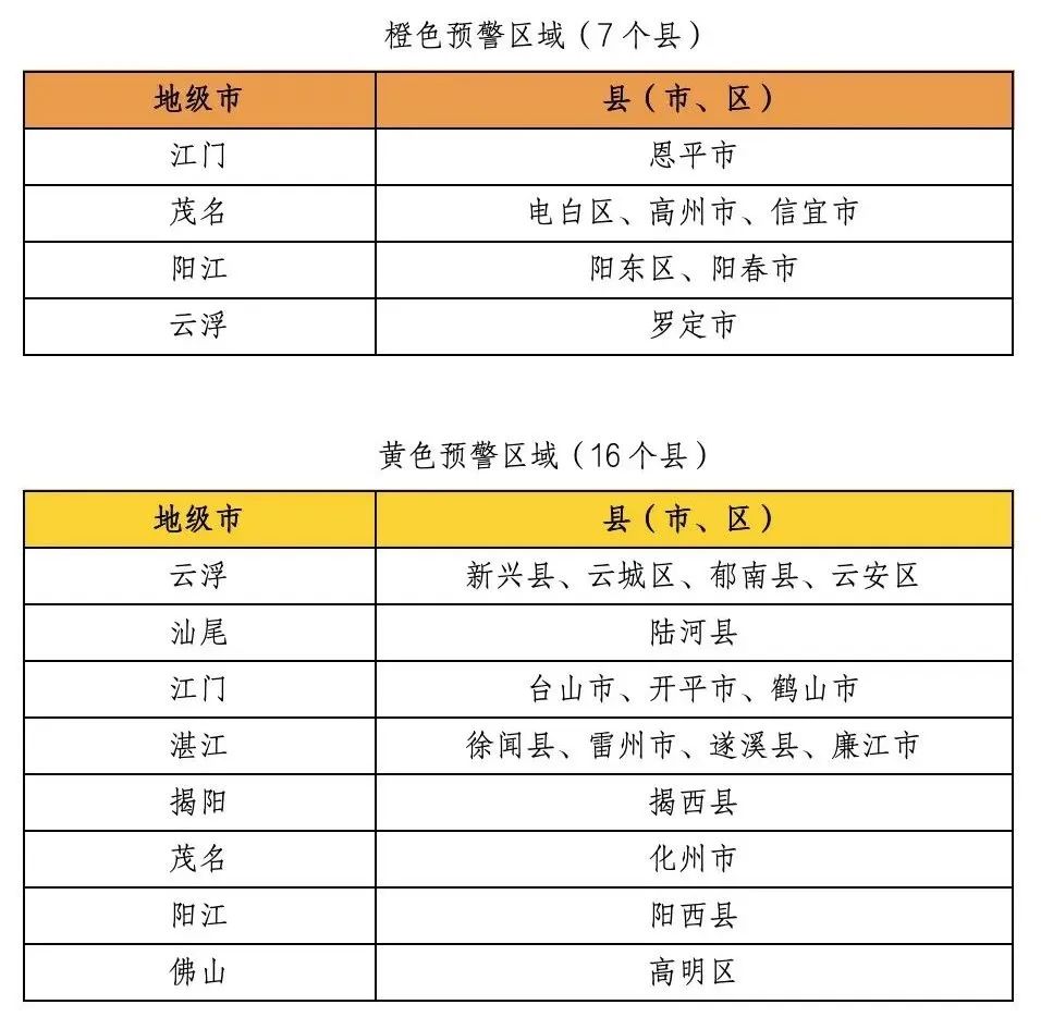 雲浮新興縣、云城區、鬱南縣、雲安區,汕尾陸河縣,江門台山市、開平市、鶴山市,湛江徐聞縣、雷州市、遂溪縣、廉江市,揭陽揭西縣,茂名化州市,陽江陽西縣,佛山高明區,局地發生山洪災害可能性較大(黃色預警)。