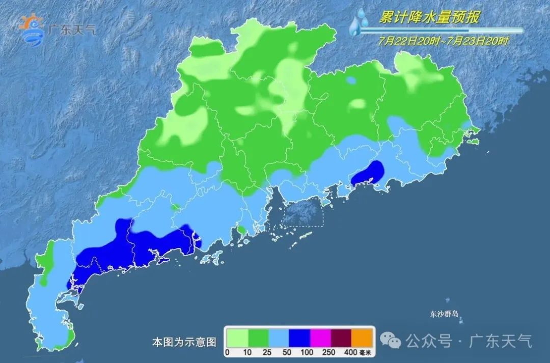 22日,珠三角南部和粵西市縣有大雨局部暴雨,粵東市縣有中到大雨局部暴雨,其餘市縣有中(雷)陣雨。最高氣温:全省大部分市縣介於29~32℃。