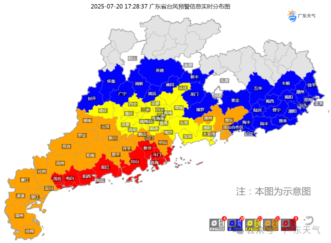 截至7月20日17時28分,廣東省有9個颱風紅色預警、22個颱風橙色預警、22個颱風黃色預警、28個颱風藍色預警和4個颱風白色預警信號生效。
