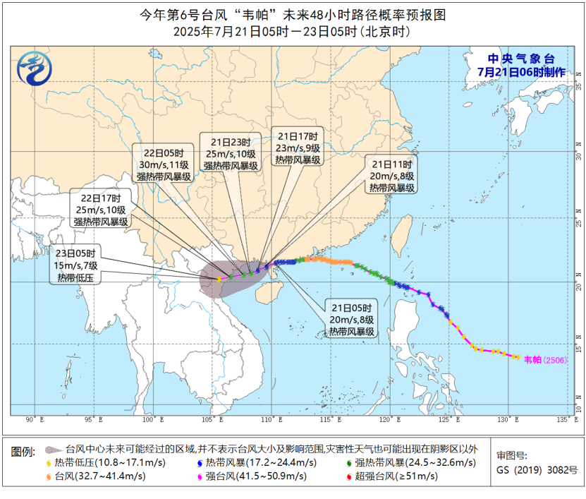中央氣象台21日6時繼續發佈颱風黃色預**警,預計,颱風“韋帕”將於今天(21日)上午移入北部灣海面,強度將再度發展,並將於22日白天在越南北部沿海再次登陸。