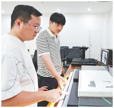 實驗室內,張展(左)正在和學生掃描錄入甲骨文拓本。