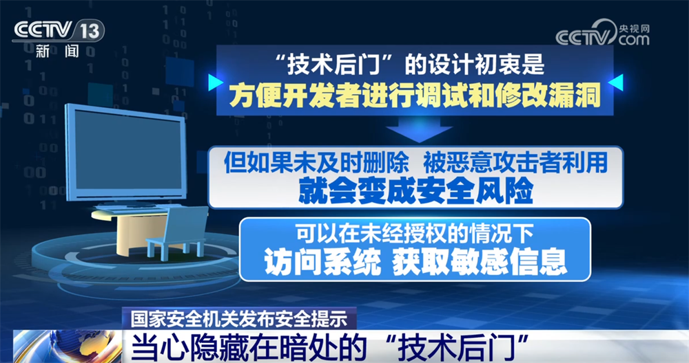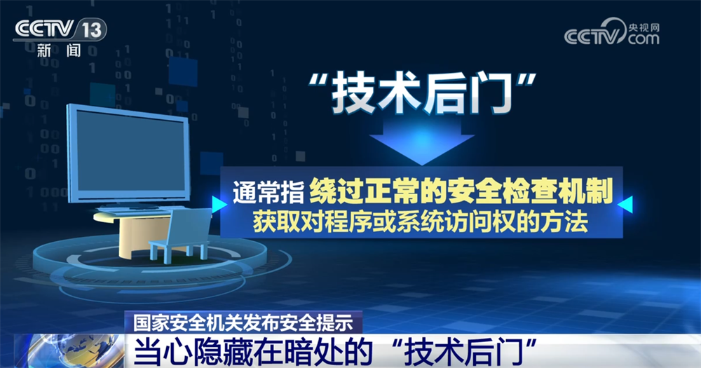 央視網消息: 網絡安全不僅關乎個人隱私、企業秘密,甚至影響國家安全。國家安全機關7月21日發佈安全提示,一些別有用心的設計或惡意植入的技術後門,可能成為失泄密的導火索。那麼什麼是技術後門?又該如何防範?一起來了解。