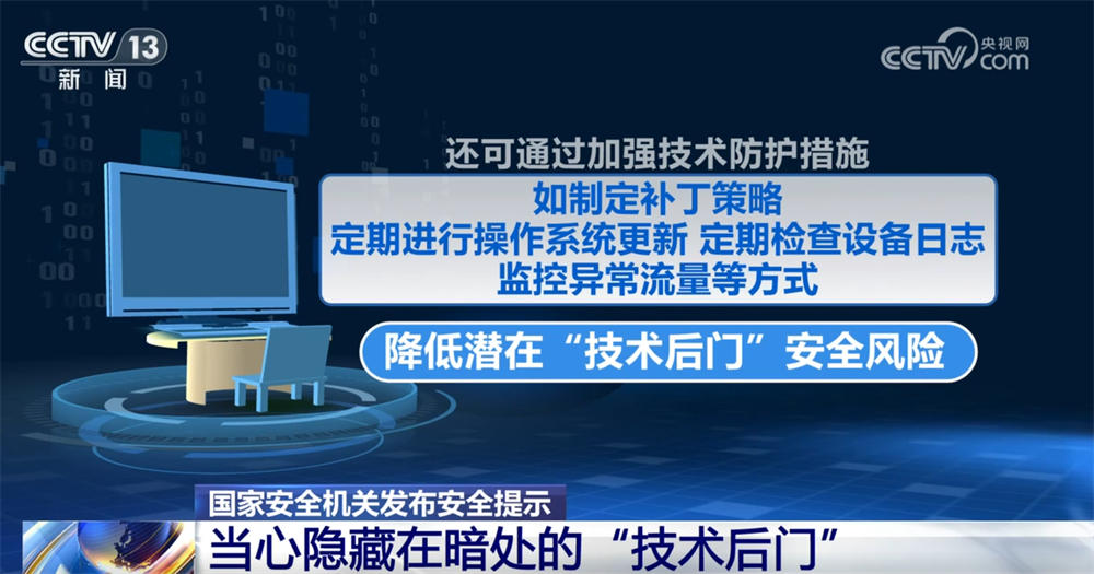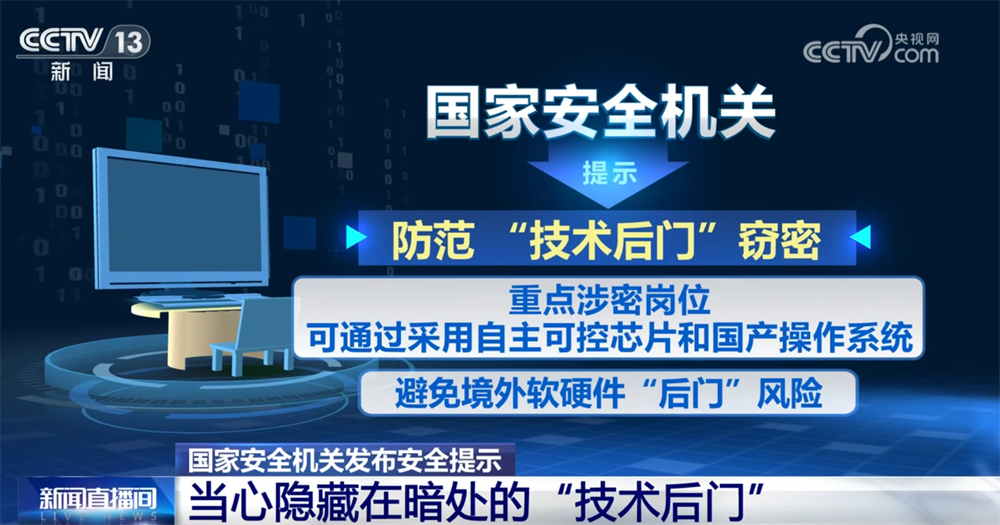 國家安全機關提示,防範 “技術後門”竊密,重點涉密崗位可通過採用自主可控芯片和國產操作系統,避免境外軟硬件“後門”風險。還可通過加強技術防護措施,如制定補丁策略、定期進行操作系統更新、定期檢查設備日誌、監控異常流量等方式,降低潛在“技術後門”安全風險。公民和組織應當配合國家安全機關做好針對網絡間諜的安全防範和調查處置工作,如發現可疑行為,請通過12339國家安全機關舉報受理電話等渠道進行舉報。