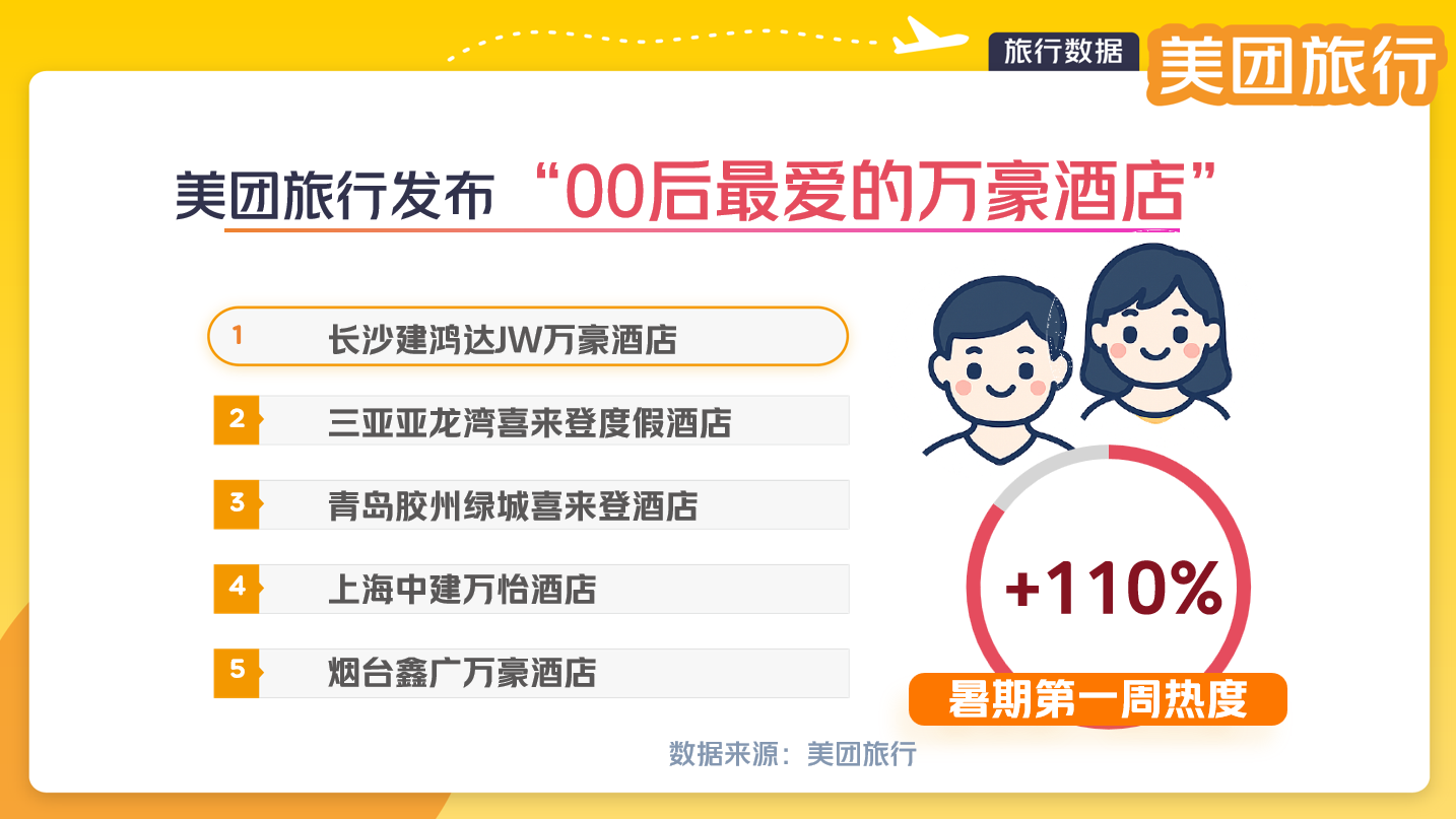 00後暑期旅行,也喜歡選擇兼顧海景江景、歷史文化、特色美食的目的地。美團旅行數據顯示,長沙建鴻達JW萬豪酒店、三亞亞龍灣喜來登度假酒店、青島膠州綠城喜來登酒店、上海中建萬怡酒店、煙台鑫廣萬豪酒店在暑期第一週熱度同比上漲均超過110%,成為00後遊客熱選。