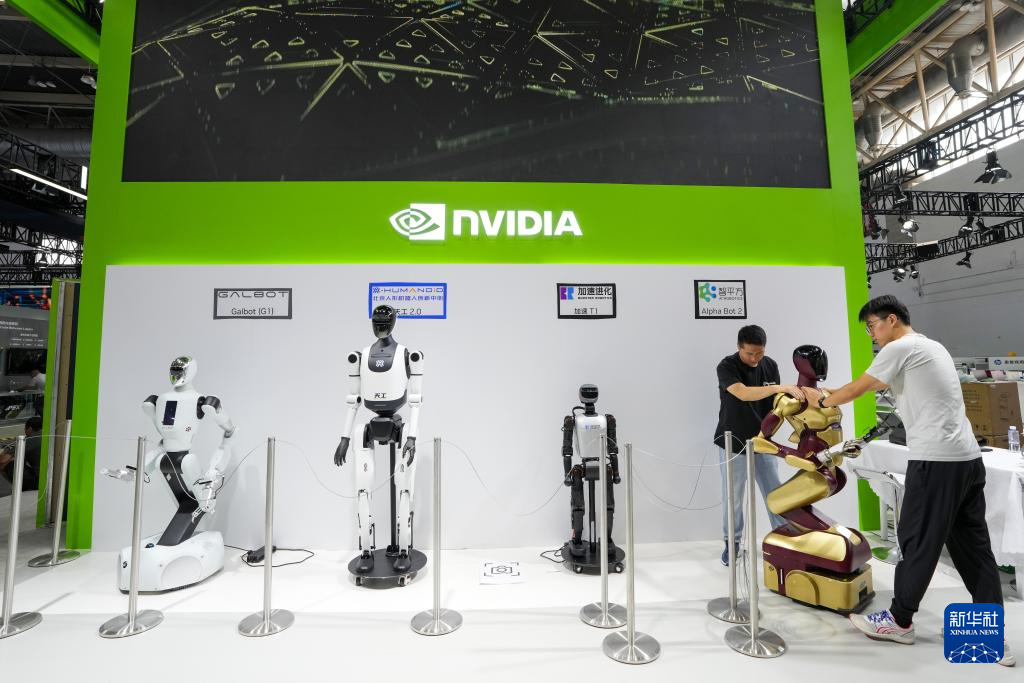 7月14日,在第三屆中國國際供應鏈促進博覽會數字科技鏈展區英偉達公司展位,工作人員在佈置展品。
