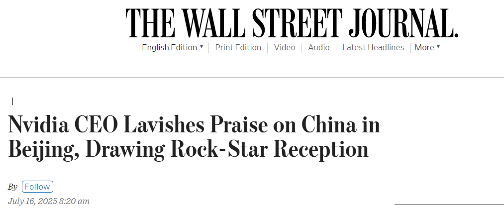 美國《華爾街日報》報道稱,市值達4萬億美元的AI芯片公司掌門人黃仁勳在訪問北京期間多次表達對中國的讚賞,盛讚中國的科技進步。