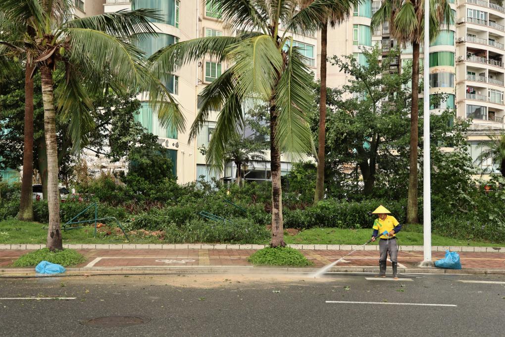 颱風過後,廣東省珠海市環衞工人正在對路面進行清洗。新華社記者 黃國保 攝