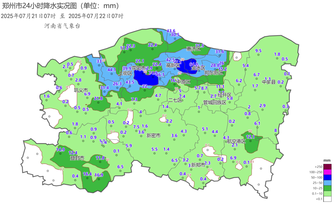 圖2 7月21日7時至22日7時鄭州市降水量分佈圖