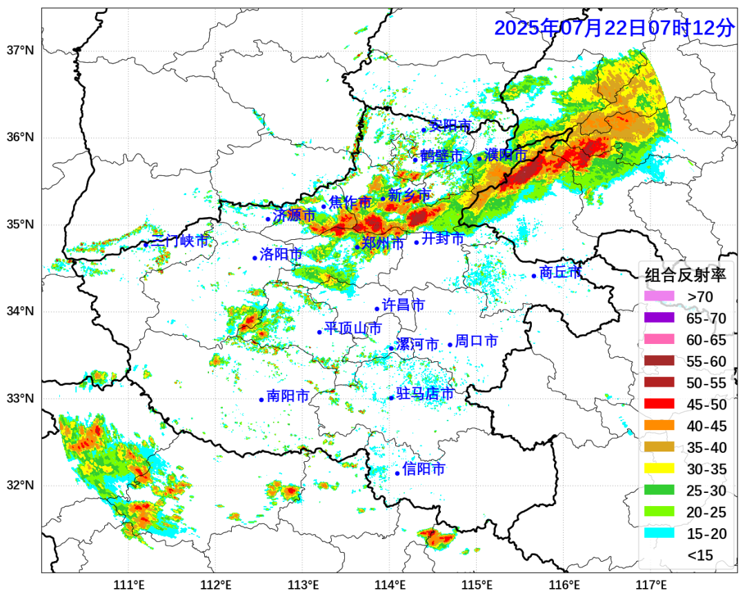 7月22日,記者從河南省氣象台獲悉,7月21日7時至22日7時,我省北中部、西南部出現陣雨、雷陣雨,其中濮陽、新鄉、焦作、洛陽、鄭州、許昌等地出現大到暴雨,並伴有短時強降水等強對流天氣。地市平均降水量濮陽22.9毫米、新鄉12.2毫米、鄭州10.5毫米,大於50毫米的有9個縣(市、區)共32站。降水量位列前三均位於台前縣,分別為:台前國家站93.4毫米、孫口87.8毫米、後方86.3毫米。最大小時降水量為滎陽市豫龍59.9毫米(7月22日1時至2時)。鄭州市大部出現陣雨、雷陣雨,其中主城區西北部、滎陽、鞏義東部出現大到暴雨,最大滎陽市豫龍74.9毫米。