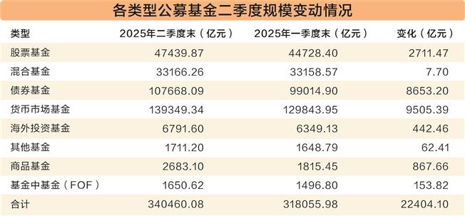 公募基金2025年二季報披露完畢。天相投顧數據顯示,公募基金二季度末管理規模歷史首次超過34萬億元,相比一季度末增加了2.24萬億元。二季度各類型基金規模迎來久違普漲,股票型基金規模增長金額超2700億元,債券型基金規模和貨幣型基金規模增長金額分別高達8653億元和9505億元。此外,小眾產品中的海外基金、商品基金和FOF規模增長金額均超百億元。
