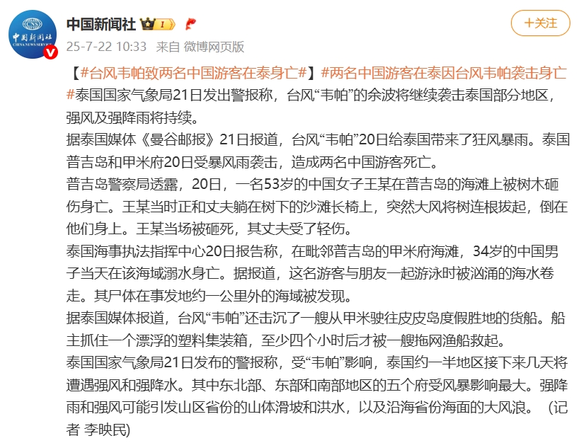 據泰國媒體《曼谷郵報》21日報道,颱風“韋帕”20日給泰國帶來了狂風暴雨。泰國普吉島和甲米府20日受暴風雨襲擊,造成兩名中國遊客死亡。