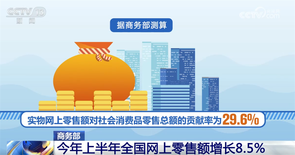 *央視網消息:*記者7月21日從商務部瞭解到,今年1—6月,全國網上零售額增長8.5%。