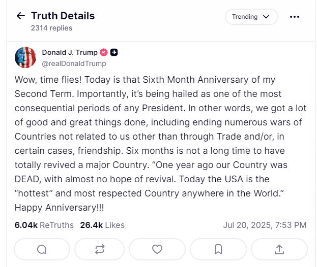 當地時間7月20日,美國總統特朗普興致勃勃地發佈帖文,慶祝自己就任美國總統滿半年。
