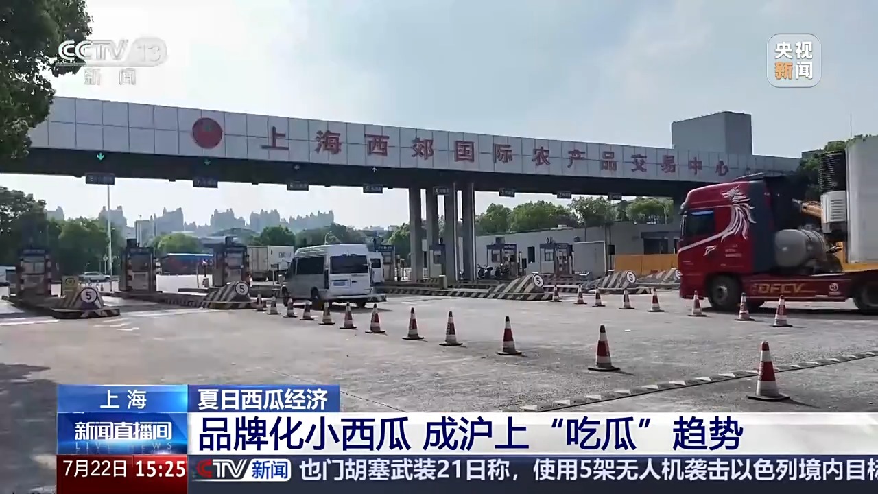 *上海西郊國際農產品交易有限公司副總經理 陸立力:*每天平均進場在1000噸,最高峯要達到2000噸。初步統計,全國大概有二十幾個省份的西瓜都會到這來。7月2日這一天,正好是南方瓜和北方瓜交集,北方瓜大量上市的一個時間,進場西瓜的總量是1647噸,壘起來的話可能有140個東方明珠那麼高。