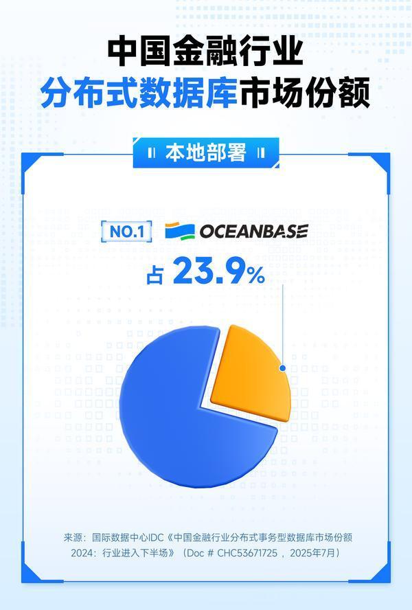金融行業歷來被視為數據庫技術的“試金石”。IDC報告顯示,2024年中國金融行業分佈式事務型數據庫整體市場規模達20.37億元,本地部署子市場規模約為14.72億元,佔比高達72.26%。在本地部署市場中,OceanBase以23.9%的市場份額領跑,並連續兩年位列第一。