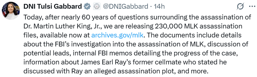 按照多家媒體的説法,特朗普政府選擇此時發佈馬丁·路德·金遇刺案檔案,似有意轉移公眾對於愛潑斯坦案的注意力。