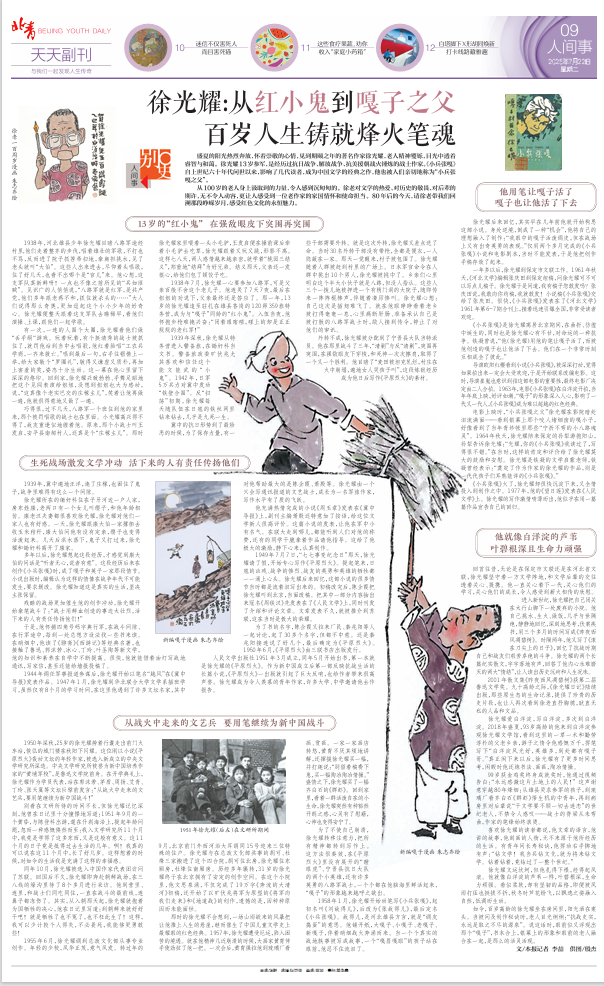 如今,百歲高齡的徐光耀坐在房間裏,陽光灑在案頭。當被問及創作秘訣時,老人目光炯炯:“抗戰史實,永遠是取之不盡的源泉”。説這話時,眼前似又浮現出那個“嘎子”,書本合上,銀幕上的形象和眼前的老人融合在一起,是那麼的活靈活現。