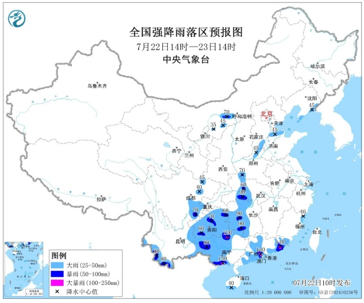 今年第6號颱風“韋帕”於7月22日上午在越南太平省沿海再次登陸,強度逐漸減弱。當日,中央氣象台繼續發佈颱風藍色預警和暴雨藍色預警。預計,海南島南部、廣東中南部、香港、澳門、福建東南部、廣西中西部、雲南東部和西南部、貴州、湖南中西部、湖北西部、重慶南部、四川盆地中部和南部以及山東西北部、河南北部和西南部、內蒙古河套地區等地的部分地區有大到暴雨,其中,廣東南部、廣西北部和南部沿海等地局地有大暴雨。
