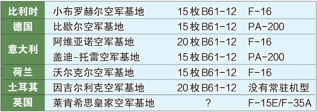 相比之下,根據北約架構下的“核共享”政策,比利時、德國、意大利和荷蘭的多家基地則採用另一套原則:核彈頭處於美國的控制之下,而執行核任務的戰鬥機則由基地所在國的飛行員駕駛。目前比利時的小布羅赫爾空軍基地部署有15枚B61-12核炸彈,由美製F-16戰鬥機掛載;德國比歇爾空軍基地有15枚B61-12核炸彈,由PA-200“龍捲風”戰鬥轟炸機攜帶;意大利蓋迪-託雷空軍基地有15枚B61-12核炸彈,由“龍捲風”戰鬥轟炸機攜帶;荷蘭沃爾克爾空軍基地有15枚B61-12核炸彈,由F-16戰鬥機掛載。根據歐洲各國空軍升級計劃,未來這些戰鬥機都將換為F-35A。(晨陽)