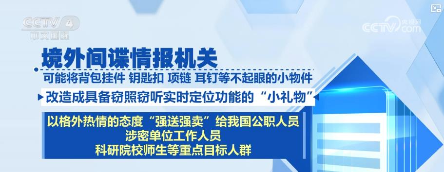 對於一些改裝的禮品,也要格外注意。境外間諜情報機關可能將揹包掛件、鑰匙扣、項鍊、耳釘等不起眼的小物件改造成具備竊照竊聽即時定位功能的“小禮物”,以格外熱情的態度“強送強賣”給我國公職人員、涉密單位工作人員、科研院校師生等重點目標人羣,妄圖非法獲取我國國家秘密和內部敏感信息。國家安全機關提示,境外出行,對行為可疑、異常熱情的境外人員要保持高度警惕,若對方提出贈送紀念禮品等要求要多加防範,避免落入境外間諜情報機關精心佈置的圈套。