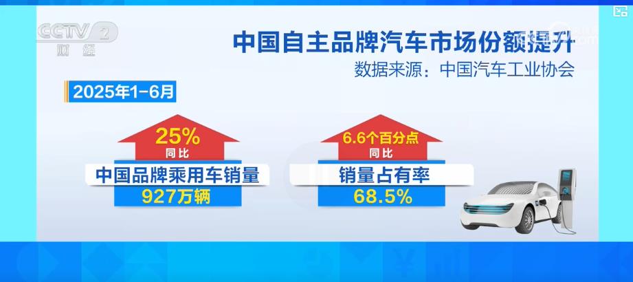 2025年1—6月,中國品牌乘用車銷量達927萬輛,同比增長25%;銷量佔有率達68.5%,同比上升6.6個百分點。