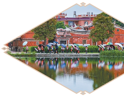 細雨濛濛,福建晉江市新塘街道梧林傳統村落,村前池塘泛起陣陣漣漪。雨水沖刷下,古厝外牆上的紅磚白石愈顯明豔。