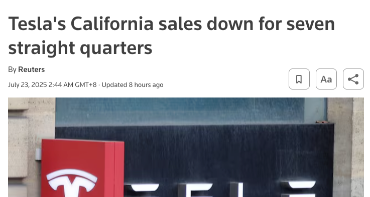 作為特斯拉全球最重要的區域市場,加州曾貢獻其北美銷量的近三分之一。然而,自2023年第四季度以來,特斯拉在該州的銷量持續承壓:2024年第二季度註冊量同比下降24.1%,2025年第一季度市場份額首次跌破50%至43.9%,創下自2012年進入加州市場以來的最低紀錄。