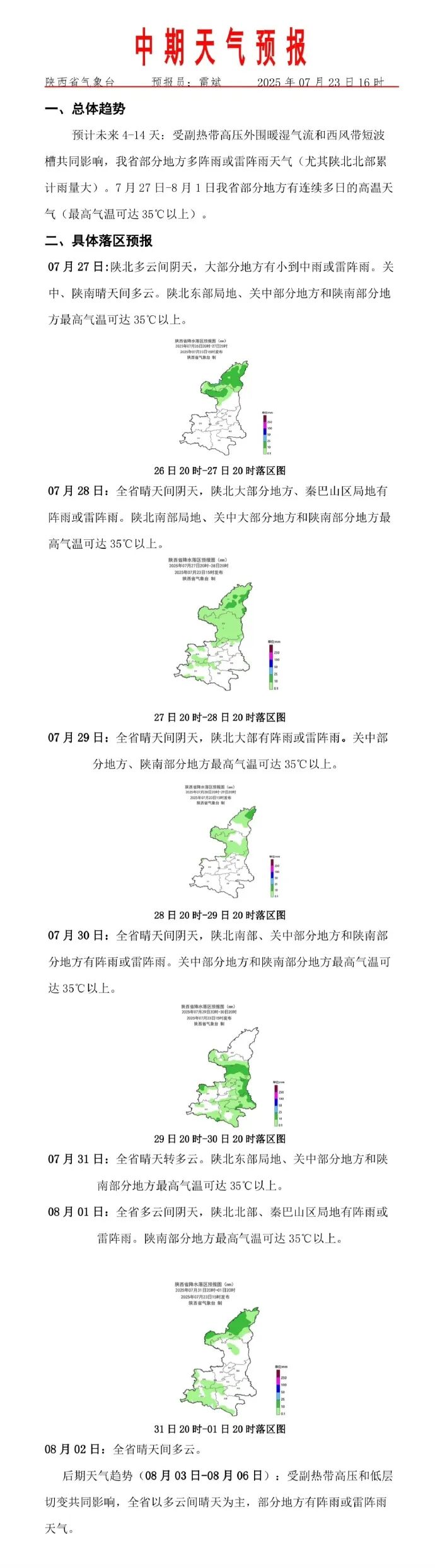 預計未來4-14天:受副熱帶高壓外圍暖濕氣流和西風帶短波槽共同影響,我省部分地方多陣雨或雷陣雨天氣(尤其陝北北部累計雨量大)。7月27日-8月1日我省部分地方有連續多日的高温天氣(最高氣温可達35℃以上)。